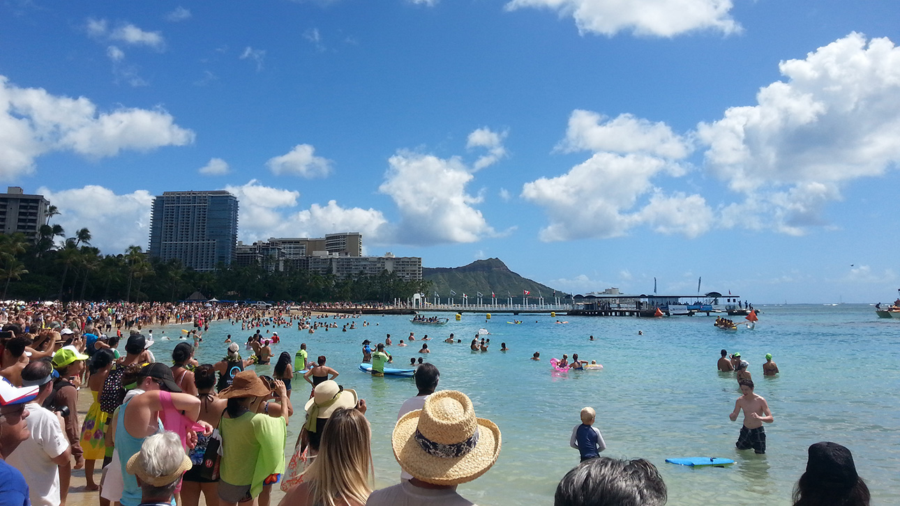 Above: Thousands of onlookers, friends, family members and team supporters gather along Duke Kahanamoku Beach in Waikiki to welcome more than 100 crews competing in the 2014 Molokai Hoe.