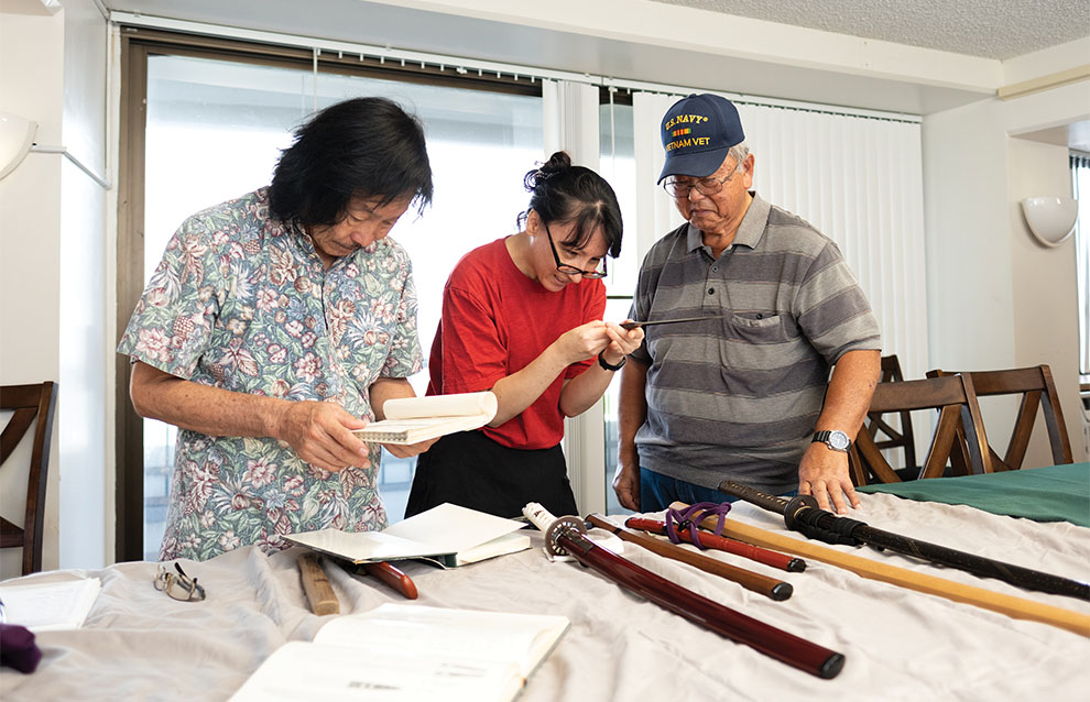 Japanese Sword Society of Hawaii members (left to right) Albert Furuto, Anne Hillier and Earl Kawaguchi examine the signatures and dates on swords. A blade's provenance is of critical importance—when or if it can be established. Hillier, who often helps translate any available documentation, says she joined the club for the opportunity to see antique swords and to help perpetuate Japanese sword knowledge.