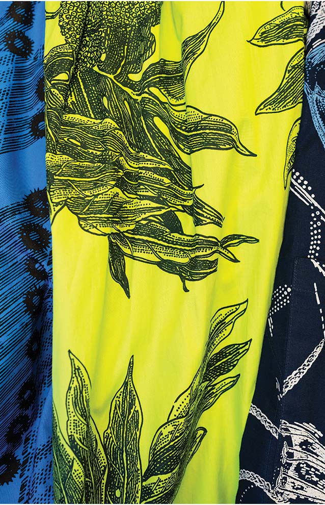 Near him are racks of his creations: simple sundresses and contemporary riffs on traditional long-sleeve muumuu and aloha shirts, all featuring his singular prints in striking color combinations.