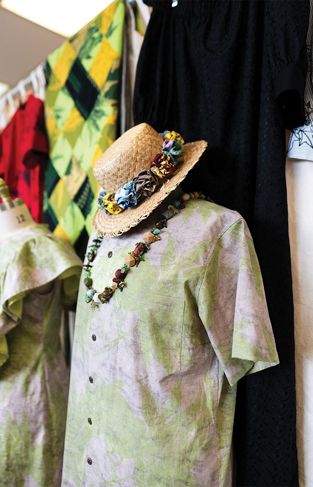 A steady stream of customers enters the shop, devotees looking for a new muumuu or aloha shirt and catching up with Awai's niece, Marvi Rosehill-Ching, who along with Gerald Chun make up the designer's team. The trio is busy dealing with daily duties as well as preparing for the Merrie Monarch Festival, the annual hula competition and Hawaiian cultural touchstone that takes place in April. Nakeu has participated in the festival's Hawaiian Arts & Crafts Fair "pretty much since the beginning of time," quips Rosehill-Ching, packing up "lock, stock and barrel" and shipping it all to Hawaii Island.