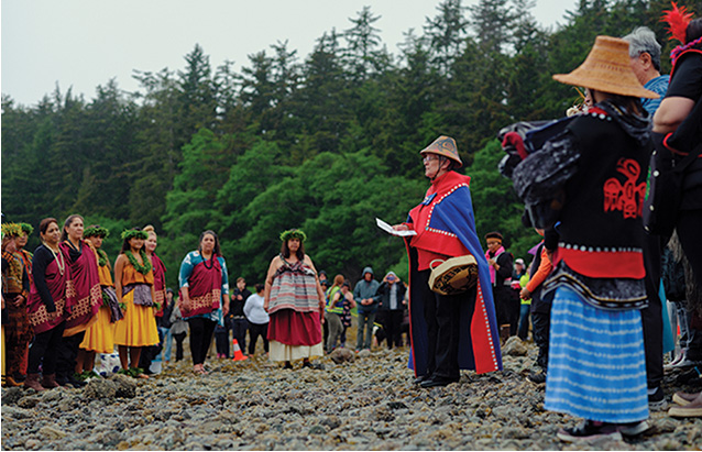 On shore, a crowd of several hundred waits expectantly in a mounting drizzle as four yaakw from around the region, including Wayne Price in his dugout, circle the Hawaiian waa amid drumming and song before pulling alongside to ferry the crew to the water's edge. A tribal elder in a sky-blue cape embroidered with fearsome sharks formally invites the crew ashore, where a delegation from Hawaii drapes them with kihei (Hawaiian ceremonial shawls) and the local hosts bedeck them with Tlingit blankets. Clan leaders from the area offer words, songs and dances of welcome, and in return dancers from Hawaii's Kamehameha Schools perform several crowd-pleasing hula, even while shivering through the rain in their traditional skirts and malo (loincloths).